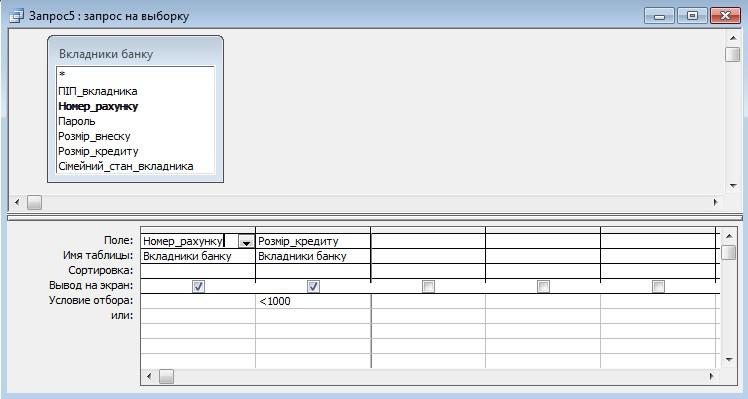 WHERE ((([Вкладники банку].Розмір_кредиту)<1000));