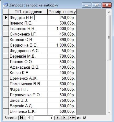 Запит №2. Вивести прізвища всіх вкладників, розмір внеску яких не перевищує 1000 грн.