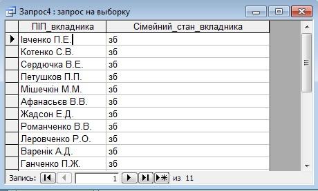 Запит №4. Вивести ПІП вкладників, у я ких сімейний стан – забезпечений “зб”.