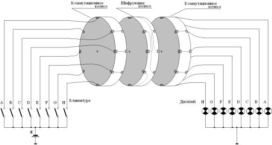 ла, для английского алфавита имели по 26 электрических контактов на каждой торцевой поверхности. Каждый входной контакт одной торцевой поверхности шифрующего диска был соединен внутри корпуса с каким-либо выходным контактом второй торцевой поверхности. Входные контакты представляли символы открытого текста; выходные контакты – символы шифрованного текста. У вспомогательных дисков контакты одной поверхности соединялись с одноименными контактами второй поверхности. Диски монтировались на одной оси в последовательности: вспомогательный диск – шифрующий диск – вспомогательный диск; при этом контакты шифрующего диска электрически соединялись с контактами вспомогательных. Входные контакты, например, левого вспомогательного диска соединялись с клавиатурой пишущей машинки; выходные контакты правого вспомогательного диска подключались к какому-либо выходному устройству, например, устройству индикации. Несложно представить, что при фиксированном угловом положении шифрующего диска электрическая схема устройства реализовывала одноалфавитную замену. Если в процессе преобразования открытого текста шифрующий диск поворачивался на углы 2πk/26, схема осуществляла многоалфавитную замену с использованием 26 смешанных алфавитов.