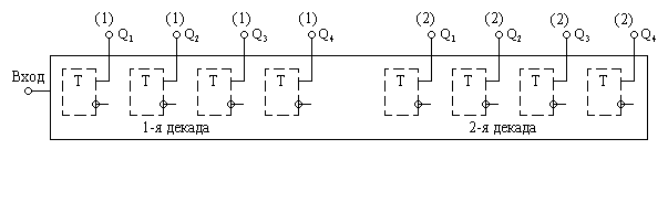 входы J и K в каждом триггере объединены и на эти входы подан уровень лог. 1, таким образом, в каждом триггере синхронизирующий вход С является счетным входом триггера;