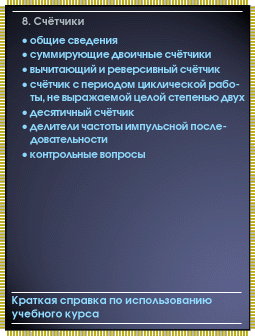 Счетчик - цифровое устройство, осуществляющее счет числа появлений на входе определенного логического уровня. В дальнейшем во всех случаях, когда это не оговаривается специально, будем полагать, что счетчик производит подсчет числа содержащихся во входном сигнале переходов с уровня лог. 0 к уровню лог. 1. При импульсном представлении логических переменных уровню лог. 1 соответствует импульс, и счетчик ведет счет поступающих на вход импульсов.