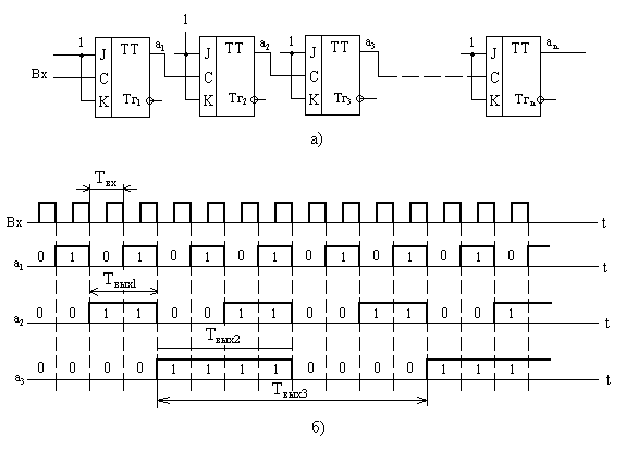 сигнал с прямого выхода триггера каждого разряда поступает на счетный вход С триггера следующего более старшего разряда, а на счетный вход триггера 1-го разряда Тг1 подаются входные просчитываемые импульсы.