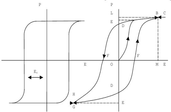 Если после достижения насыщения уменьшать напряженность поля, то поляризованность кристалла будет изменяться не по начальной кривой ОАВ. а по кривой СВD (рнс.6. б), и при поле равном нулю кристалл остается поляризованным. Величина поляризованности, определяемая отрезком OD, называется остаточной поляризованностью. Экстраполяция участка СВ на ось координат отсекает отрезок ОЕ, приближенно равный спонтанной поляризованности. Отрезок OL равен полной поляризованности сегнетоэлектрика, состоящей из спонтанной и индуцированной поляризованности. Если изменить направление поля, то поляризованность будет уменьшаться, изменит знак и при определенном поле опять достигнет насыщения.
