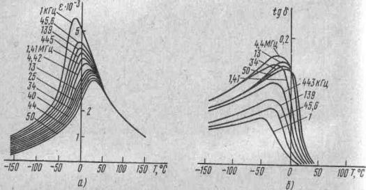 Рисунок 12 - Зависимость диэлектрической проницаемости (а) и тангенса угла диэлектрических потерь (б) в сегнетоэлектрике Pb(Mg1/3Nb2/3)О3 от температуры при различных частотах.