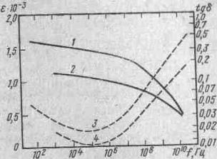 Общий характер частотной зависимости диэлектрической проницаемости и потерь в слабых полях в поликристаллическом титаните бария показан на рисунке 13, где согласно исследованиям М. М. Некрасова и Ю. М. Поплавко приведены диэлектрическая проницаемость и tg d при поле смещения Есм = О (кривые 1 и 3) и Есм = 10 кВ/см (кривые 2 и 4). Как видно из рисунка, заметное уменьшение e и возрастание tg d наблюдается в области частот 108-1010 Гц. По-видимому, это связано с инерционностью движения доменных границ.
