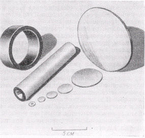 Преобразователи могут быть весьма малых размеров - порядка 1 мм и менее. Описан вибрационный тензометр, который дает электрическое напряжение 100 мВ при механическом смещении L/106, где L - его размер в сантиметрах. Этот сигнал в 100 раз выше, чем в случае резистивного тензометра. Высокая диэлектрическая проницаемость сегнетоэлектриков здесь также является преимуществом, так как позволяет даже при низких частотах получить низкий электрический импеданс прибора (низкий импеданс часто упрощает измерения электрических сигналов). Отметим также, что из сегнетоэлектрической керамики можно изготавливать элементы самых разнообразных форм (рис. 17), например, нетрудно изготовить устройство, фокусирующее излучаемые акустические волны в любом нужном месте. Для того чтобы использовать самые высокие значения пьезоэлектрических коэффициентов, необходимо температуру поддерживать постоянной с высокой точностью. Но это не всегда легко, особенно в тех случаях, когда к сегнетоэлектрику прикладываются сравнительно большие электрические сигналы; в этих случаях становится существенным тепло, выделяемое в результате потерь на гистерезис (оно пропорционально площади петли гистерезиса). Однако во многих случаях пик нужного параметра удается сгладить, что позволяет отказаться от необходимости прецизионного термостатирования. Нередко аномально высокие значения коэффициентов можно использовать не только ниже температуры перехода, но и выше нее.