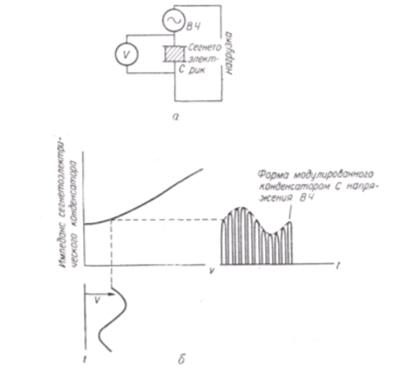 Принцип работы диэлектрического усилителя мощности иллюстрируется на рисунке 18 напряжение смещения V изменяет емкость сегнетоэлектрического конденсатора, управляя, таким образом, величиной сигнала высокой частоты. При изменении V сигнал высокой частоты соответственно модулируется, как схематически показано в правой части фигуры. Рабочие элементы диэлектрических усилителей можно изготавливать как из керамики, так и из монокристаллов, причем обычно используются цирконат - титанат свинца или титанат бария - стронция. Иногда выбирают такой материал, чтобы температура перехода была несколько ниже рабочей температуры, с целью избежать трудностей, вызванных большим пьезоэффектом, и потерь на гистерезис. Иногда же, наоборот, выбирают температуру перехода несколько выше рабочей температуры, так как это обеспечивает лучшую температурную стабильность усилителя. Предел чувствительности ниже Т0 определяется шумом, обусловленным движением доменных стенок.