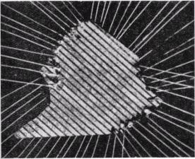 Как было показано в лаборатории автора, нанесение электродов для создания плотности ячеек порядка 800 ячеек на 1 см2 не представляет трудностей (рисунок 20). При переполяризации 0,1 мм2 площади пластинки титаната бария за время, например, 10 мксек средний ток равен около 5 мA. Амплитуда считывающего импульса составляет от 10 до 20 B при использовании пластинки из титаната бария толщиной 0,1 мм. Если требуется неразрушающее считывание, то необходимо устройство для восстановления первоначального состояния поляризации ячейки после считывания. Добавочная регенерация необходима также потому, что воздействием на ячейку импульсов половинной амплитуды нельзя полностью пренебречь. С точки зрения стандартов вычислительной техники ни одно из этих усложнений не является очень большим.