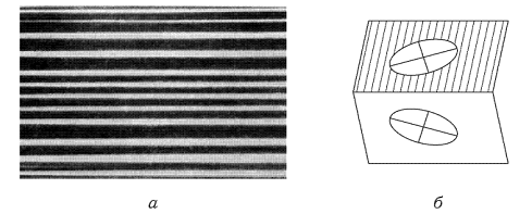 (а) и схема ориентации оптических индикатрис в соседних доменах (б) кристаллов