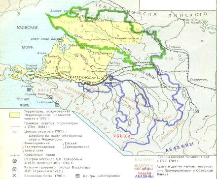 Основную массу населения Прикубанских степей на тот момент, по мнению Н.А. Сотавова [18], составляли кочевые племена кубанских (бештаугорские, или пятигорские) ногайцев, расселившиеся по устьям рек Инджик (Зеленчук), Аре, Малый и Большой Янкиль и насчитывавшие 10 тыс. фамилий. Адыги занимали горные районы и всё левобережье Кубани к востоку от линии Темрюк-Анапа и только одно селение - Заны располагалось на правом берегу этой реки.
