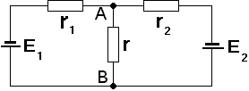 1.Определить разность потенциалов между точками А и В, если Е1 = 8 В, Е2 = 6 В, r1 = 4 Ом, r2 = 8 Ом, r = 6 Ом. Внутренним сопротивлением источников тока можно пренебречь.