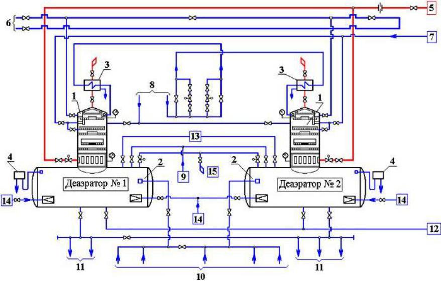 1 – деаэрационные колонки №1 и 2; 2 – аккумуляторные баки; 3 – охладители выпара; 4 – гидрозатворы; 5 – подвод греющего (отборного пара) пара; 6 – подвод основного конденсата турбины; 7 – подвод конденсата сетевых подогревателей; 8 – подвод химочищенной добавочной воды; 9 – подвод конденсата греющего пара ПВД; 10 – подвод питательной воды от насосов (линия разгрузки питательных насосов); 11 – отвод воды к питательным насосам; 12 – сливные (дренажные) трубопроводы; 13 – уравнительные линии; 14 – подвод пара к барботажным соплам; 15 – сбросной паропровод с предохранительным клапаном