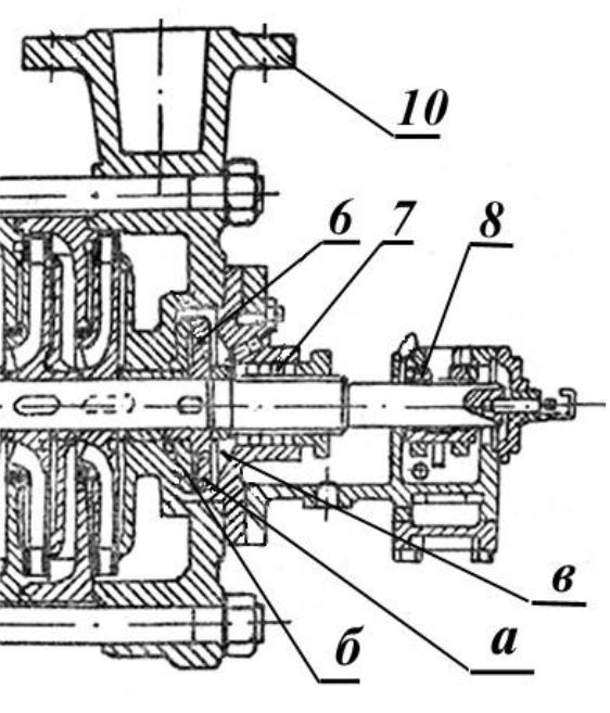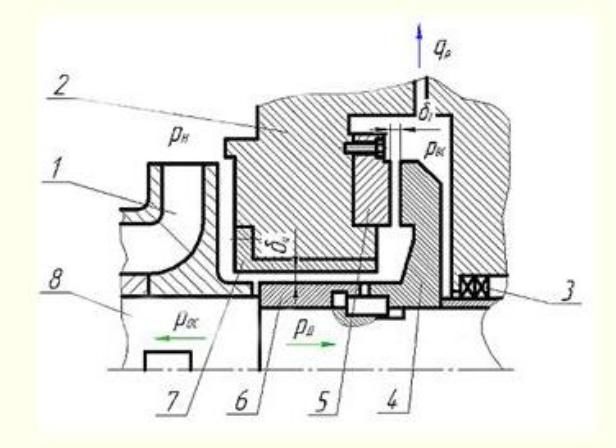 4, 6 – диск ротора; 5 – подушка пяты (диск статора); δ1 – соединение со всасом насоса; Рн – напор; δ0 – радиальный зазор; 8 – ротор.