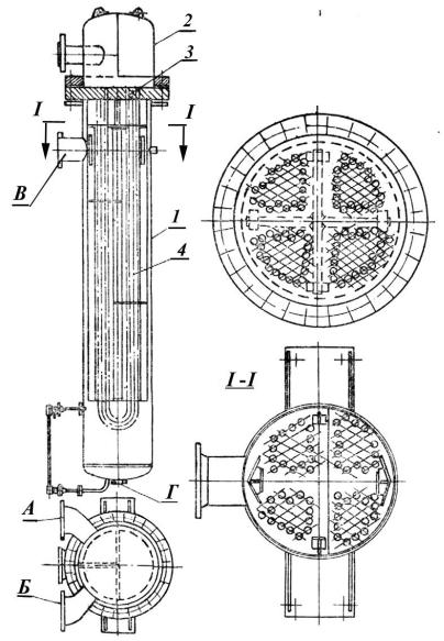 камера; 3 – трубная доска; 4 - U-образные трубки; А - вход воды; Б - выход воды; В -