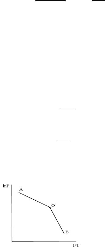 Уравнение (1) описывает линию возгонки ОВ, уравнение (2) – линию испарения ОА. (Данные в условии зависимости включают в себя десятичный логарифм, но он может быть преобразован в натуральный домножением на 2,303, и вид графика от этого не изменится.)