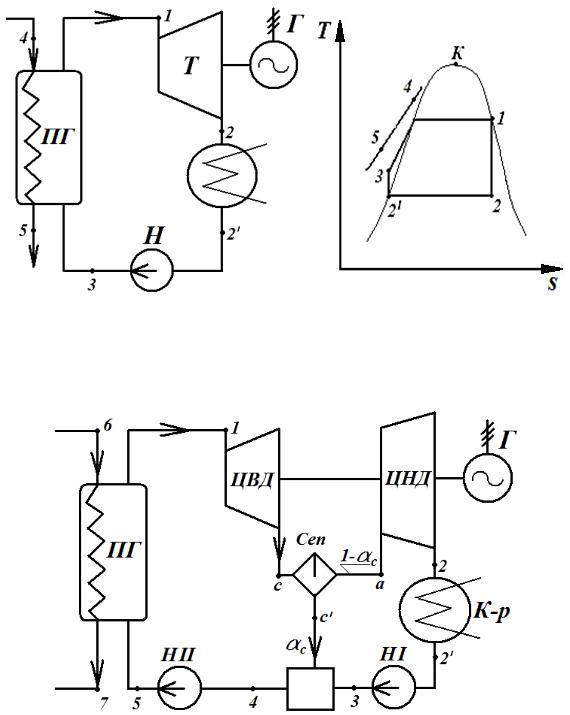 Рис. 14. Принципиальная схема и цикл ПТУ на насыщенном паре