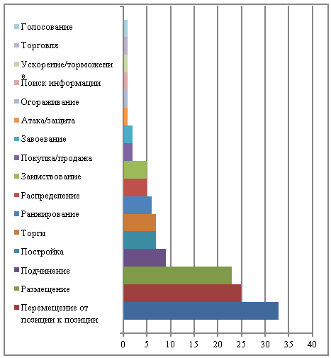 Одна из отличительных черт еврогеймов - наслаивание механик друг на друга таким образом, что создается довольно сложная система из разнообразных субмеханик. Поэтому ради наглядности в данном анализе я решила сосредоточиться на основных, определяющих игру механиках и субмеханиках, применяемых для достижения цели игры. Воспользовавшись перечнем Ярвинена из 40 механик, я отобрала те, что лучше всех характеризуют основные механики и субмеханики каждой из рассмотренных мною игр. На диаграммах 1 и 2 представлен обзор механик, используемых в еврогеймах.