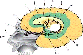зубчатая извилина, 12 - парагиппокампальная извилина, 13 - крючок.