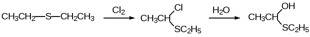 Атом серы повышает подвижность атомов водорода в соседних СН‑связях. Тиоэфиры легко хлорируются в α‑положение к атому серы. Образующиеся продукты хлорирования гидролизуются водой с образованием полутиоацеталей:
