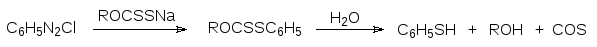 Побочным продуктом в этой реакции становится дифенилсульфид, образующийся в результате взаимодействия соли диазония с первичным продуктом реакции тиофенолом. Более избирательный способ получения тиофенолов основан на реакции солей диазония с ксантогенатами. Продуктами этой реакции становятся S‑ариловые эфиры О-алкил-дитиоугольных кислот, которые, как это было представлено выше в схеме получения алкантиолов, гидролизуются с образованием тиофенолов: