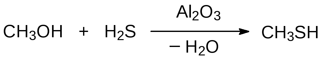 Однако промышленное производство метантиола, используемого, в частности, в производстве аминокислоты метионина, основано на алкилировании сероводорода метанолом в газовой фазе при катализе оксидом алюминия при температуре 300-350 °С: