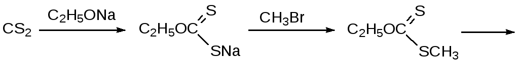 Аналогичный способ получения тиолов представлен алкилированием и последующим гидролизом моноэфиров дитиоугольной кислоты (ксантогенатов), образующихся по реакции алкоголятов с сероуглеродом: