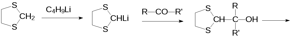 Активированные атомы водорода СН-связей в тиоэфирах могут замещаться атомами лития в реакциях, например, с бутиллитием. Эту особенность можно использовать в синтезе самых разных соединений. В качестве примера можно привести получение α‑гидроксизамещенного альдегида по схеме: