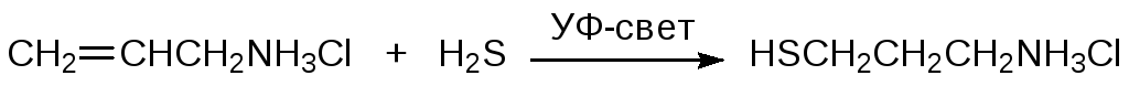 Тиольные соединения образуются также в результате присоединения сероводорода к двойным связям олефинов. В присутствии генераторов свободных радикалов или при облучении УФ светом присоединение протекает против правила Марковникова. Так, например, в кварцевом реакторе гидрохлорид аллиламина реагирует с избытком сероводорода в спиртовой среде в свете ртутной лампы с образованием гидрохлорида 3‑меркаптопропиламина: