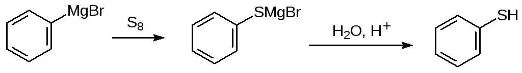 Тиольные соединения образуются также в реакциях магнийорганических соединений с элементной серой. В частности, этим способом удобно получать тиофенолы:
