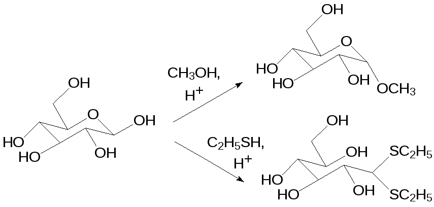 Тиольные соединения значительно легче чем спирты образуют с карбонильными соединениями тиоацетали и, соответственно, тиокетали. В качестве примера можно привести взаимодействие глюкозы с этантиолом. Карбонильная группа глюкозы участвует в образовании циклического полуацеталя (пиранозная форма глюкозы). При нагревании с метанолом в присутствии кислоты с сохранением пиранового цикла этерифицируется аномерная гидроксильная группа и образуется метилглюкозид, представляющий собой полный ацеталь, тогда как взаимодействие глюкозы с этилмеркаптаном приводит к раскрытию цикла и к образованию дитиоацеталя глюкозы линейного строения:
