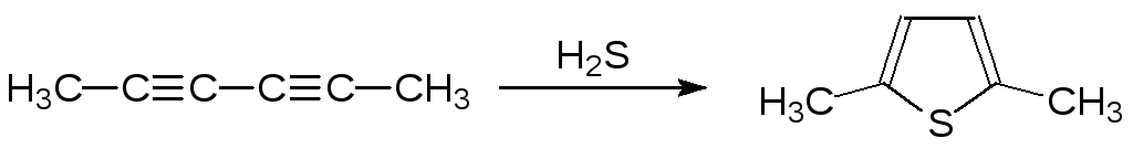 1,3-Диацетиленовые соединения реагируют с сероводородом в слабощелочной среде с образованием тиофенов, например: