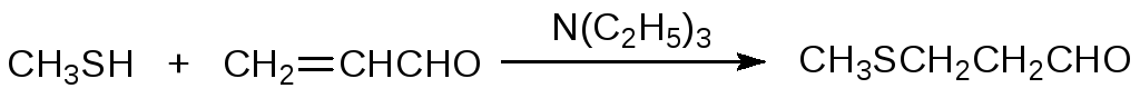 Против правила Марковникова в присутствии оснований сероводород и тиолы присоединяются к активированным электроноакцепторными группами двойным связям. В частности, так из метилмеркаптана и акролеина при катализе третичным амином в промышленном масштабе получают 3‑метилтиопропионовый альдегид (метиональ) – промежуточный продукт в производстве D,L‑метионина: