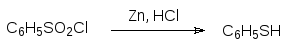 Хлорангидриды ароматических сульфокислот достаточно устойчивы в кислых водных средах при комнатной температуре. В соответствии с этим их можно использовать для синтеза тиолов ароматического ряда (тиофенолов) восстановлением цинком в соляной кислоте: