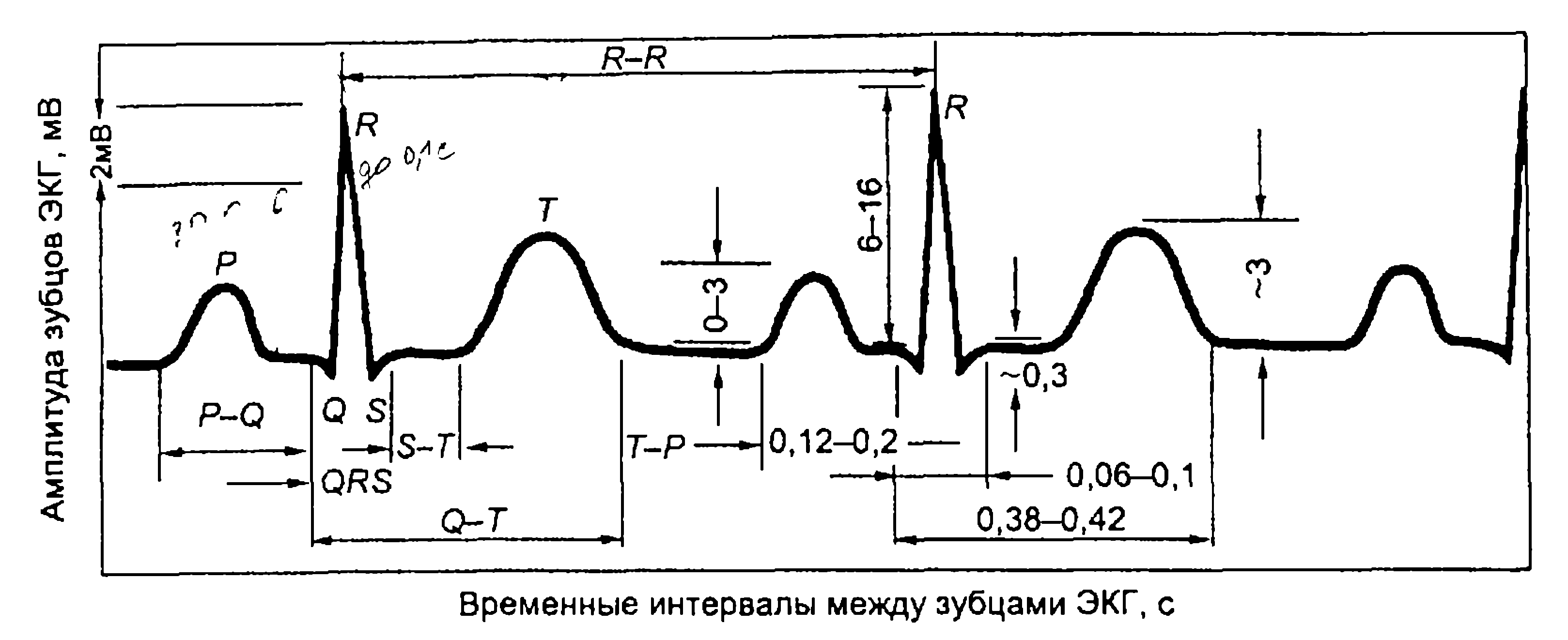 Интервала Q— Т зависит от частоты сердечных сокращений и это электрическая систола желудочков; 0,38-0,42с.
