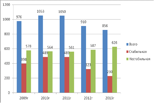 За весь период число поступивших в стационар с нестабильной стенокардией превышало число больных со стабильной стенокардией. Максимальное число госпитализированных с нестабильной стенокардией было в 2013году и составило 626человек. Минимальное число госпитализированных было в 2011году и составило 561человек.