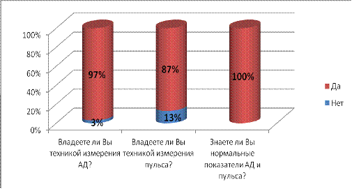 Вывод: результаты анкетирования показали, что практически каждый владеет техникой измерения АД, Ps и абсолютно все знают их нормальные показатели. Следовательно, при ухудшение самочувствия, больные могут проконтролировать свое состояние.