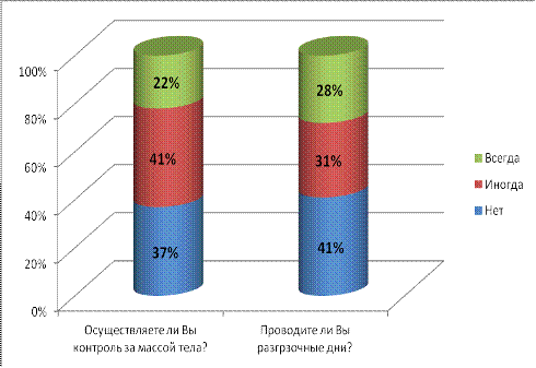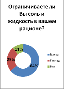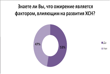 Вывод: ожирение оказывает прямое влияние на сердце с развитием структурно - функциональных изменений. Среди пациентов только 53% знают, что ожирение является фактором, влияющим на развитие ХСН. 22% из которых контролирует свою массу тела. При увеличении веса повышается артериальное давление, что наряду с необходимостью обеспечить кровью возросшую массу вынуждает ослабленное сердце работать с повышенной нагрузкой. Для активации снижения массы тела у больных рекомендуются разгрузочные дни, но лишь 28% из всех больных соблюдают эту рекомендацию.