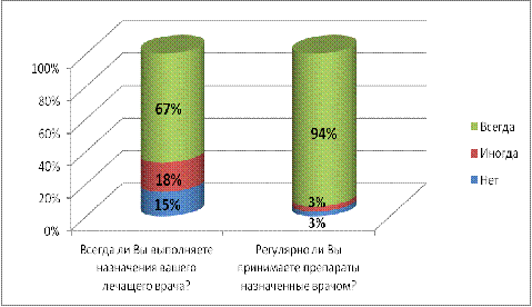 Вывод: еще одна важная проблема - соблюдение рекомендаций врача и выполнение всех назначений. Находясь в стационаре, всё контролирует медицинская сестра. Как только пациенты выписываются, они о многом забывают, или не считают нужным выполнять. По результатам анкетирования 67% всегда соблюдают рекомендации врача и 94% не прекращают прием препаратов, следуя назначениям.