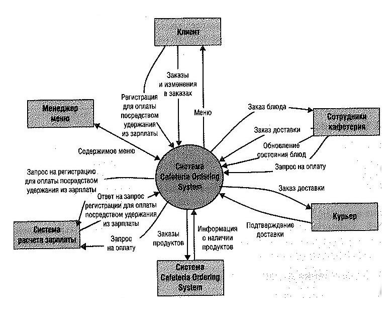 Cafeteria Ordering System – это новая система, которая заменяет текущие ручные процессы заказа и получения обедов в кафетерии Process Impact. Контекстная диаграмма на рис. 1 показывает внешние объекты и системные интерфейсы для версии 1.0. Предполагается выпустить несколько версий системы, чтобы в конечном итоге удалось встроить ее в службу заказов нескольких близлежащих ресторанов, работающую через Интернет, а также службы авторизации кредитных и дебетовых карт.