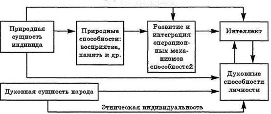 Духовные способности проявляются в творениях искусства и литературы, в деяниях мудрецов и пророков. Когда мы говорим об историческом движенииг мы выделяем природные и духовные способности. В индивидуальном развитии духовные способности формируются на основе природных, отражая духовную сущность народа, систему ценностей, значений и личностных смыслов (рис- ЗД 5).