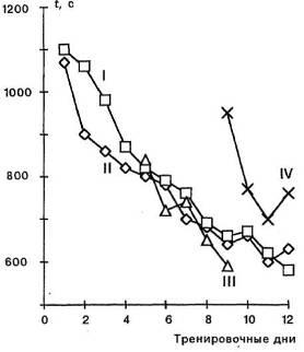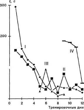 Определенный эффект дало и упражнение в оценке временных интервалов, однако максимальное достижение за 12 тренировочных дней в IV экспериментальной группе оказалось меньше, чем в остальных.