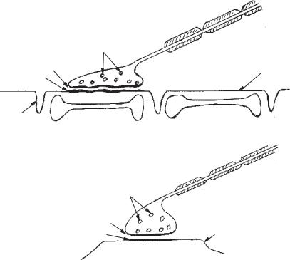 Для порівняння на рис. 12, А наводиться нервово-м’язовий синапс. Одна з головних функцій пресинаптичного закінчення (синаптосоми) полягає у виділенні медіатора під впливом ПД, що поширюється нервовим волокном. У пресинаптичних закінченнях помітні округлі утворення діаметром 20–50 мкм. Це везикули, або міхурці, які в різній кількості «нагромаджуються» в нервових закінченнях. Везикули розпо-