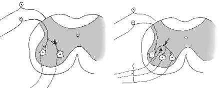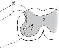 Латеральне гальмування. Гальмівний ланцюг нейронів впливає не тільки на збуджену клітину, але й на сусідні нейрони, в яких збудження є слабшим або зовсім відсутнє. Таке гальмування називається латеральним, бо ділянка гальмування, яка утворюється, міститься збоку (латерально) від збудженого нейрона. Воно відіграє особливо важливу роль у сенсорних системах, створюючи явище контрасту (рис. 15, б).