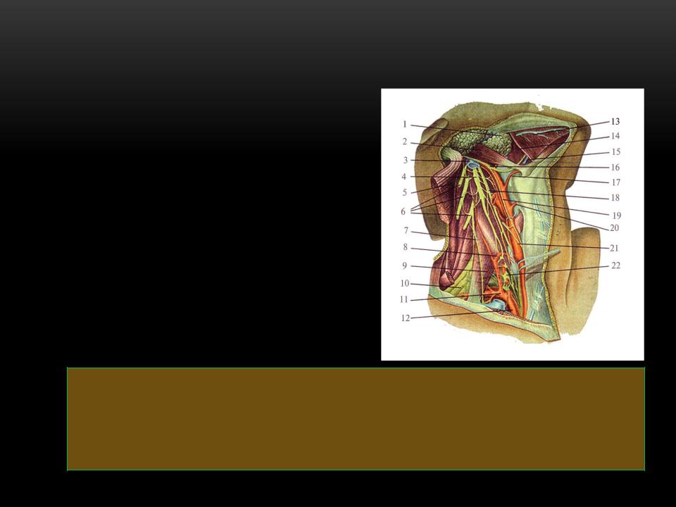 1 – gl. submandibularis; 2 – m. digastricus (venter posterior); 3 – v. jugularis interna; 4– ganglion cervicale superior tr. sympathici; 5 – m. sternocleidomastoideus; 6 – plexus cervicalis; 7 – n. phrenicus; 8 – a. thyroidea inferior; 9 – m. scalenus anterior; 10 – plexus brachialis; 11 – tr. thyrocervicalis; 12 – a. subclavia; 13 – m. mylohyoideus; 14 – m. hyoglossus; 15 – v. lin-gualis; 16 – n. hypoglossus; 17 – a. lingualis; 18 – n. vagus; 19 – radix superior ansae cervicalis; 20 – a. thyroidea superior; 21 – a. carotis communis; 22 – ganglion cervicale inferior tr. sympathici.