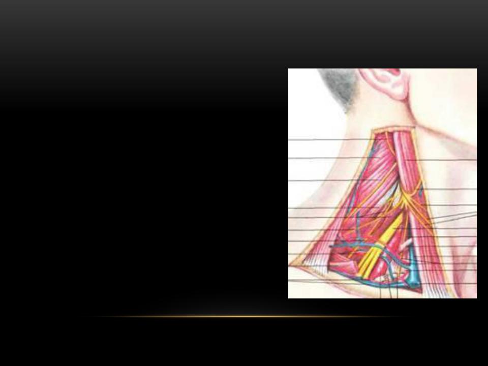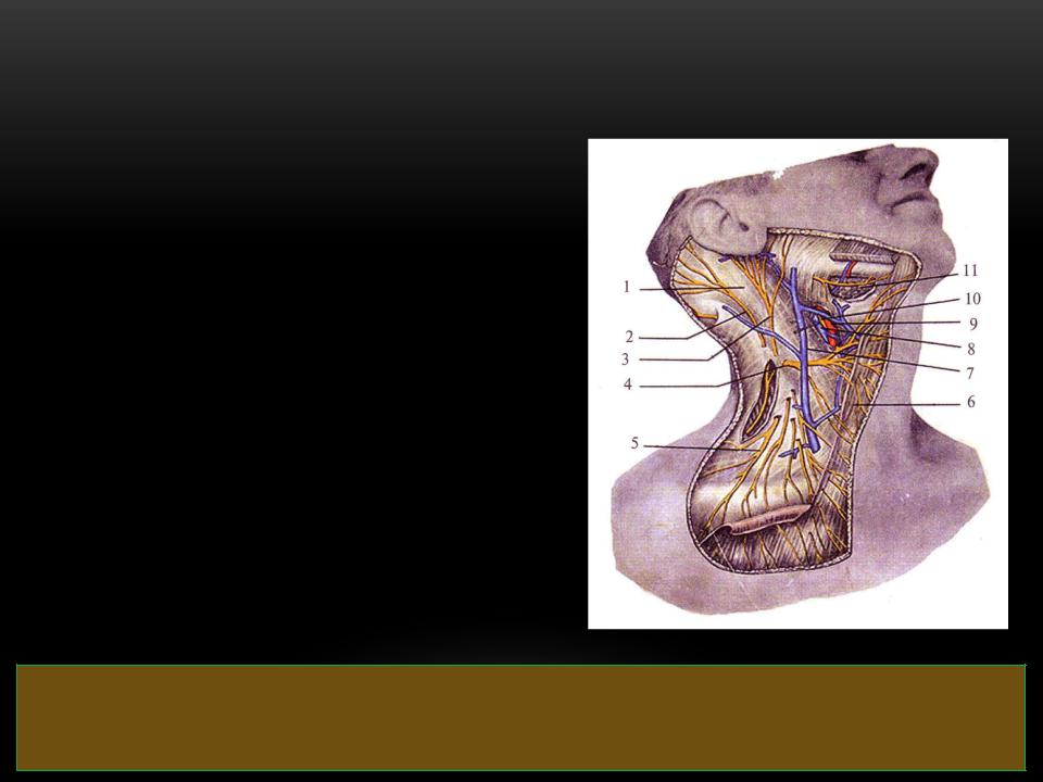 Между 1-й и 2-й фасциями в нижнем отделе области, вдоль заднего края грудино-ключично-сосцевидной мышцы,
