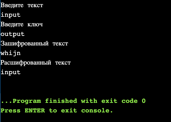 К примеру входной текст будет: input А ключом будет являться: output То на выходе мы получим: whijn