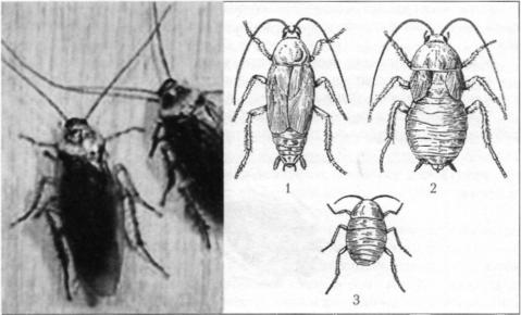 Тараканы. Всего у нас в стране зарегистрировано 55 видов тараканов, 1/5 часть которых относится к синантропным (рис. i6). В населенных пун ктах обитают рыжие, черные (американский пепельный встречается в боль ших городах) тараканы. Они термофильны, влаголюбивы и всеядны (по лифагия), выполняют роль мусорщиков в природе.