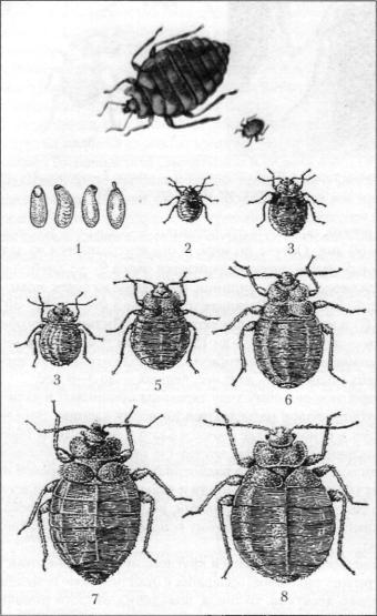 Рис. 17. Фазы развития постельного клопа Cimex Lectularius: 1 — яйца; 2—6 — ли чинка I—V стадий; 7 — самец; 8 — самка (по Лярскому П.П. с соавт., 1985)
