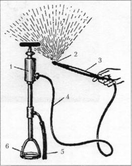 Ручные аппараты для порошкообразных средств представляют собой пневматические и поршневые распылители, отличающиеся незначительной модификацией. При помощи насоса в резервуар с порошком нагнетают воз дух, под давлением которого и происходит распыливание порошка. Для обработки поверхностей применяют наконечник, на конце которого имеет ся шарообразный купол с отверстиями, а для распыления в щели использу ют щелевидный наконечник.